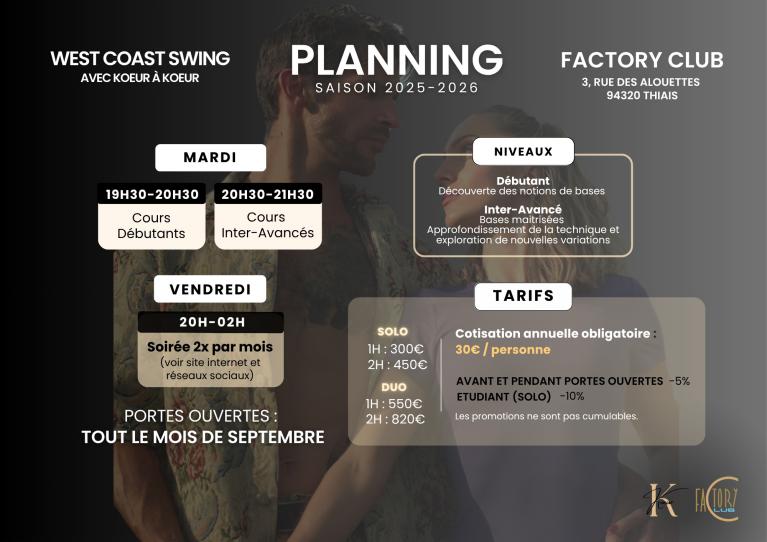 Depuis 25 ans, le Factory Club est un véritable tremplin pour les passionnés de danse ! 💃🕺 De nombreux talents ont émergé sur notre piste, que ce soit en Rock, Salsa, Bachata, West Coast Swing, Kizomba et bien plus encore ! 🎶✨